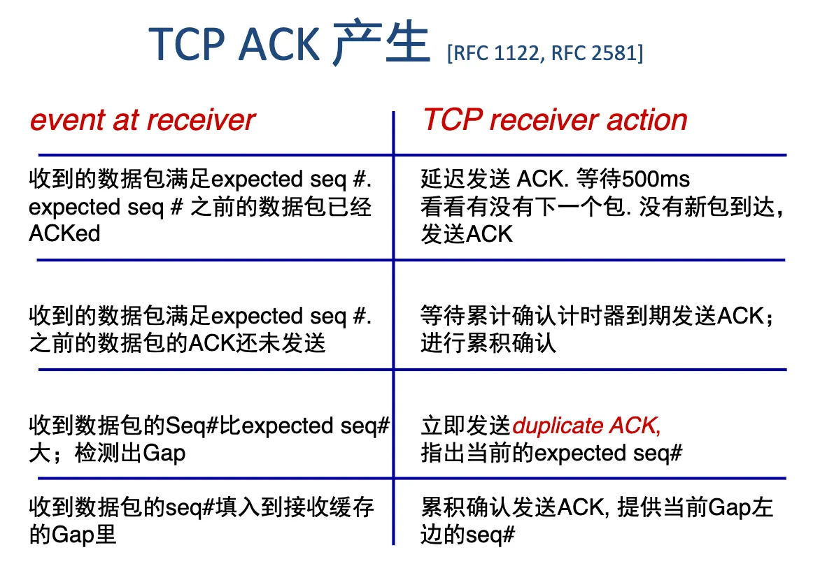 对于 TCP_Receiver 也需要做一些修改,主要原因是在快重传和超时重传的“冲突”。超时重传一次传整个窗口的包,会导致 Receiver 响应 ACK 的时候,Sender 会收到多个 ACK,这样就会导致快重传的条件被满足。按照要求,应当对于所有的按序到达的包或者已经被确认过的包(重发的包)都延迟 500ms 累积确认,而不只是窗口左沿的包。